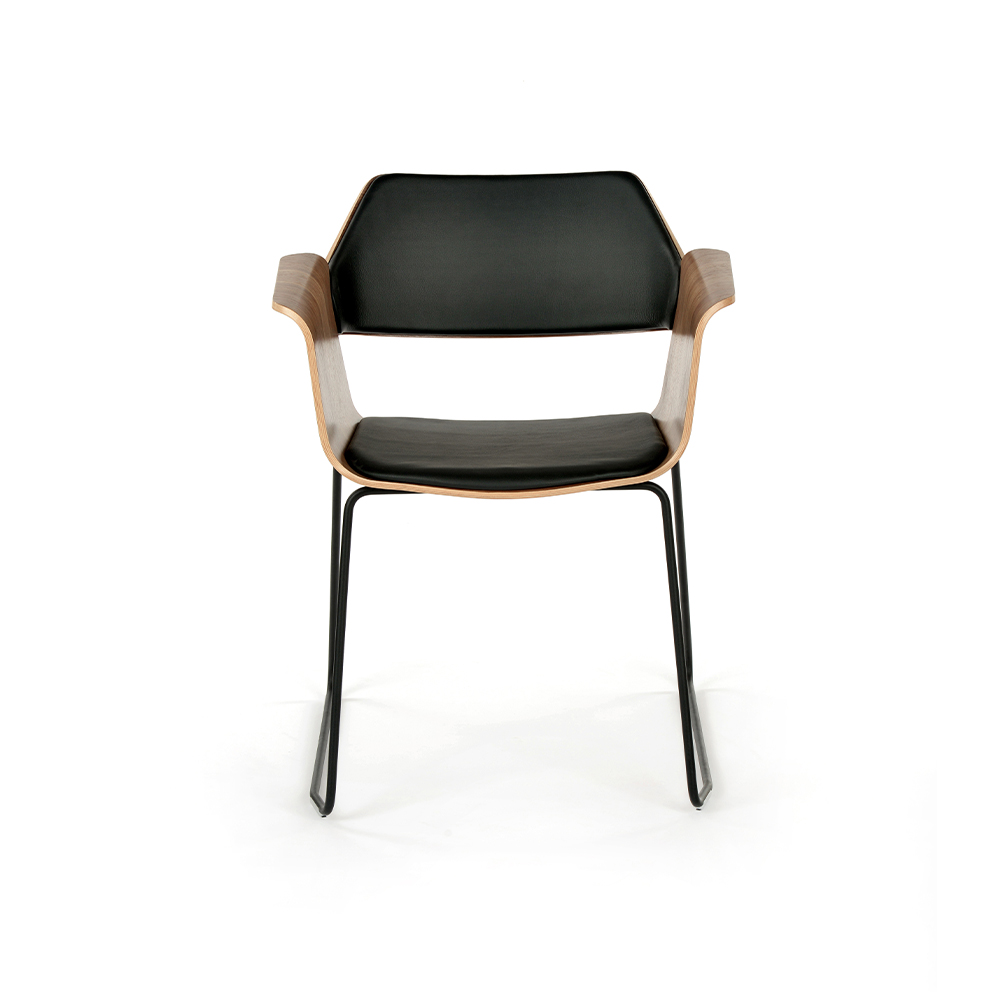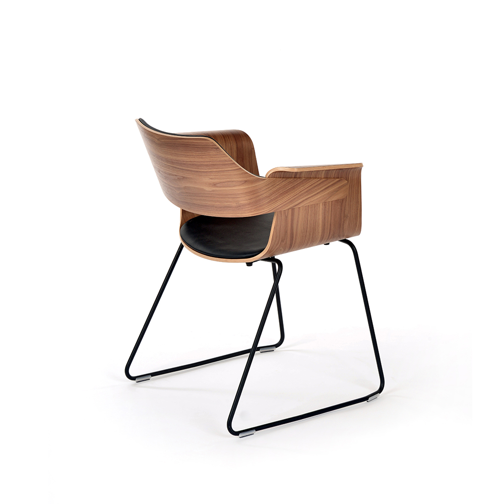 The Flagship armchairs convey the natural warmth and character of wood, but are soft in their shape and thus conform well to the human body. The chair is available with tubular metal frame legs for furnishing of both domestic and contract environments.