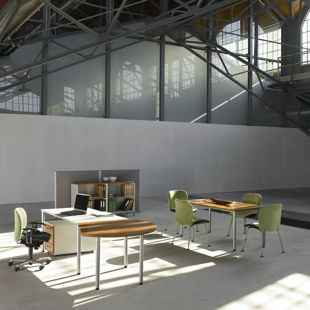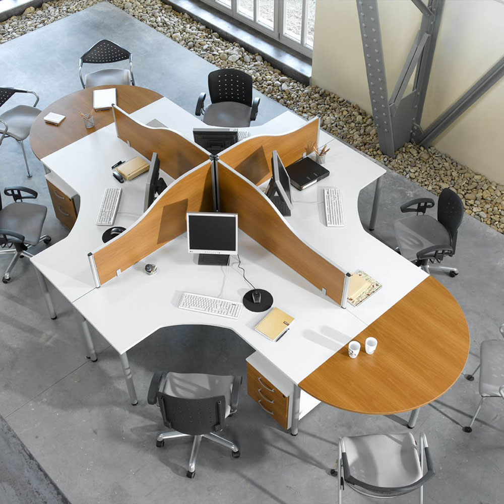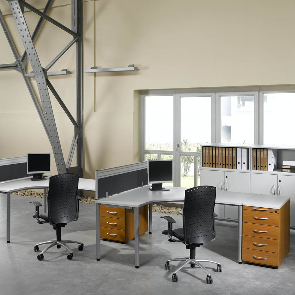 We designed MetaOffice desks for workplaces where mainly teamwork is done. Administrative work processes are assisted by desk heightening counters and variable desk combination. Screens installed on desks, as well as the optional use of containers, make the appearance of an office diverse. The airy design enables unobstructed movement and freedom of space use. The curved indentations of tabletops almost “embrace” us, make us an integral part of the office and thus increase efficiency. Complementary elements assist cooperation and provide us with the feeling of mutual effort.